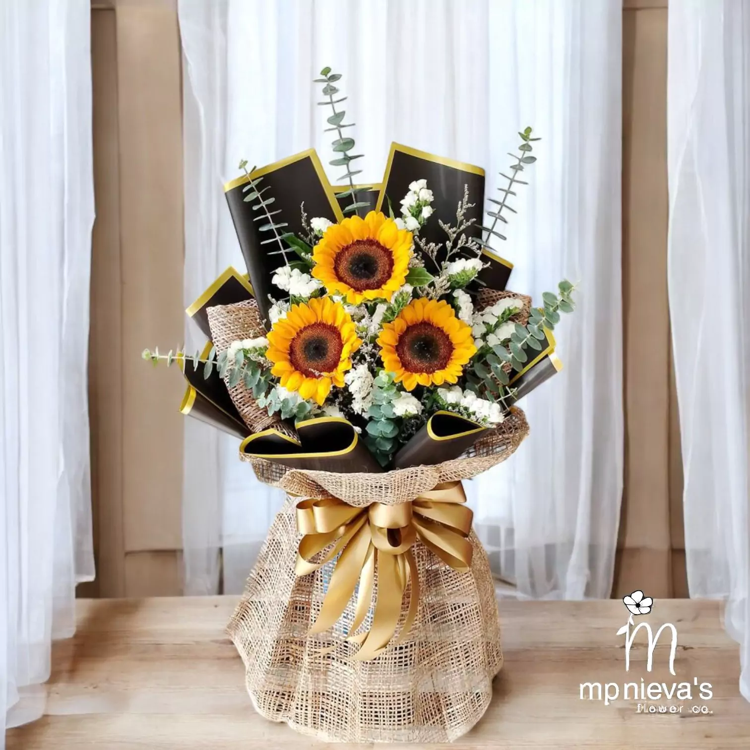 This is a beautiful bouquet that combines the cheerful brightness of sunflowers with a striking, rustic-chic presentation.